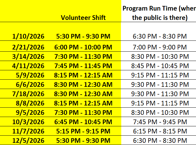 - Note: the program run time is NOT the volunteer shift. We need volunteers to arrive early to set up, and clean up after the event ents. See the specific shift time in yellow.